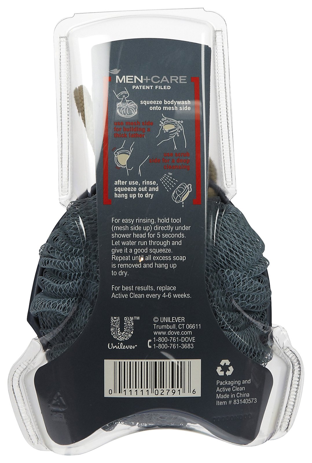Dove® Men+CareTM Active Clean Dual-Sided Shower Tool works with body wash for extra scrubbing power you can’t get from just using your hands. The mesh side delivers the perfect amount of thick cleansing lather, and the scrub side helps exfoliate for a deeper clean. Easy to grip and easy to hang. For best results, replace every 4-6 weeks.